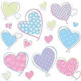 What's better than wearing your heart on your sleeve? Wearing it on your walls! These brightly-colored pastel hearts are wonderful for girls of all ages who need a little love in their room. Each heart is differently patterned, and like all RoomMates, is completely removable and repositionable. Use them over and over again wherever you please... on furniture, walls, mirrors, and more. Border Specs 4 sheets 10" x 18" Wall Decals and Size 16 pc Approx. Size Varies from 2" wide x 1.8" high to 9.75" wide x 10.5" high